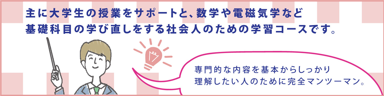 大人の電気数学カリキュラムでは解析学や線形代数など数学、電磁気学、電気回路など基礎科目を学び直しできます。